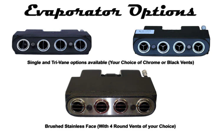 Complete A/C kit for 1964-1967 Mustangs with a 289 or 302 CI V-8 engine. This kit is designed to fit the early Mustangs that did not have a console that went to the bottom of the dash. This Evaporator comes with your choice of Single, Dual and Tri-Vane Vents. Specify at checkout what vent style you prefer. The evaporator unit is designed to fit under the dash without interfering with the foot space of the driver or passenger. The system will work with the 289 and 302 cubic inch engine with a three bolt crank pulley. The system uses R-134a refrigerant.